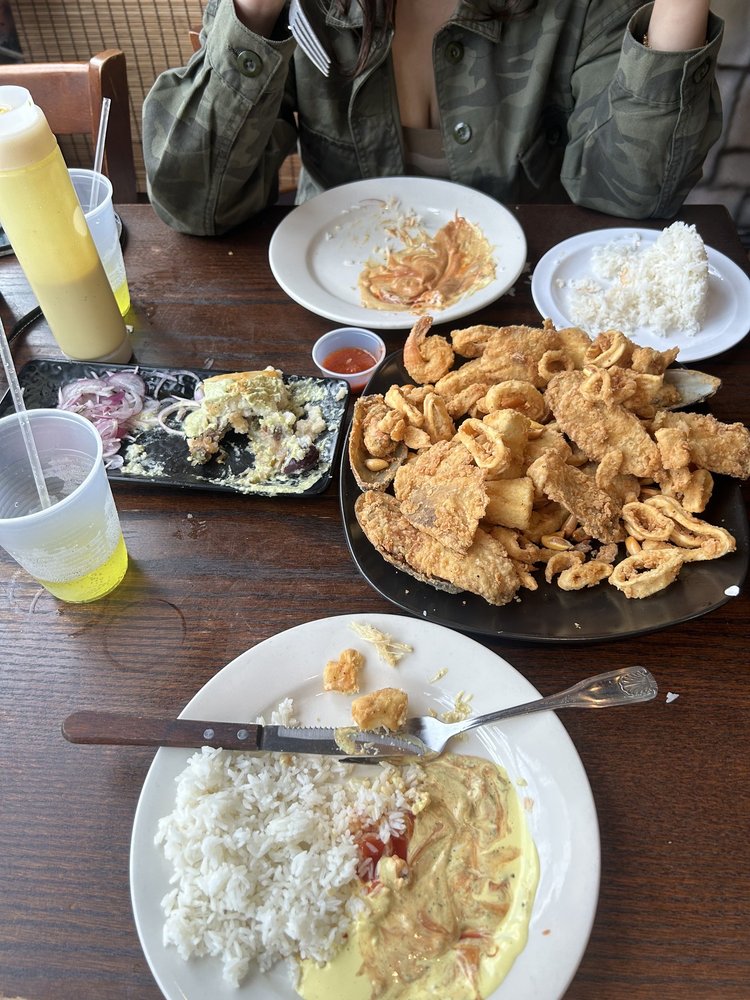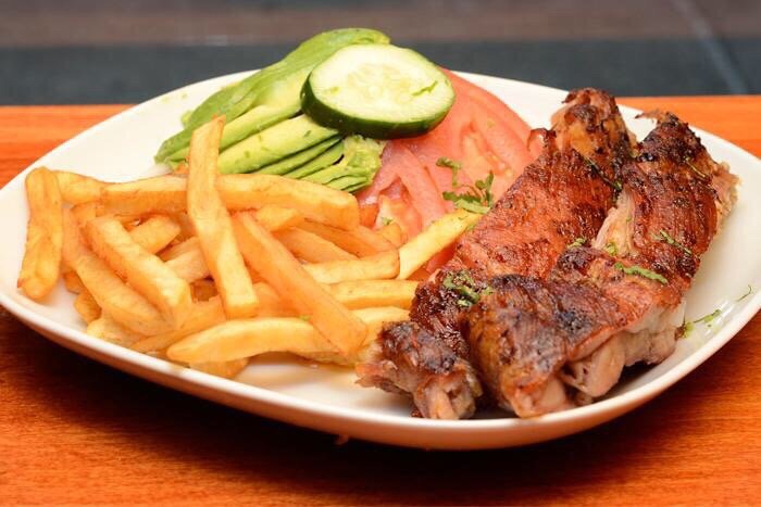 whole chicken, french fries, chaufa criollo rice, salad and L soda.