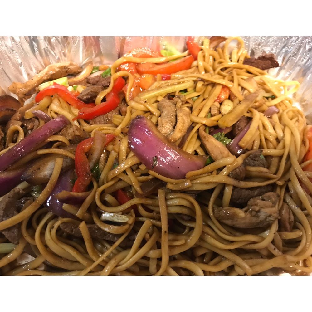 Sauteed spaghetti with beef, chicken, tomatoes, onions & house seasoning.