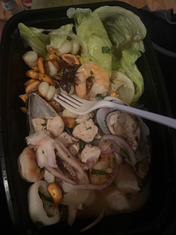 Seafood, shrimp and fish marinated in lime juice with onions, sweet potatoes and lettuce.