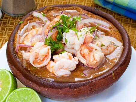 Marinated fish & shrimp in lime juice with onions, sweet potatoes and lettuce.